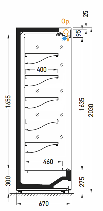 - Fermeture par portes coulissantes double vitrage avec éclairage LED BLANC supérieur uniquement , (éclairage LED BLANC tous niveaux en o ption)