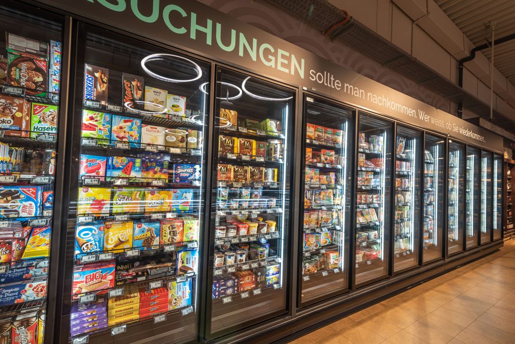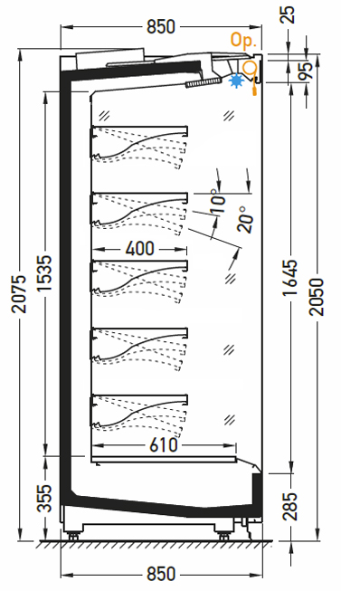 - Fermeture par portes coulissantes double vitrage avec éclairage LED BLANC supérieur uniquement , (éclairage LED BLANC tous niveaux en option)