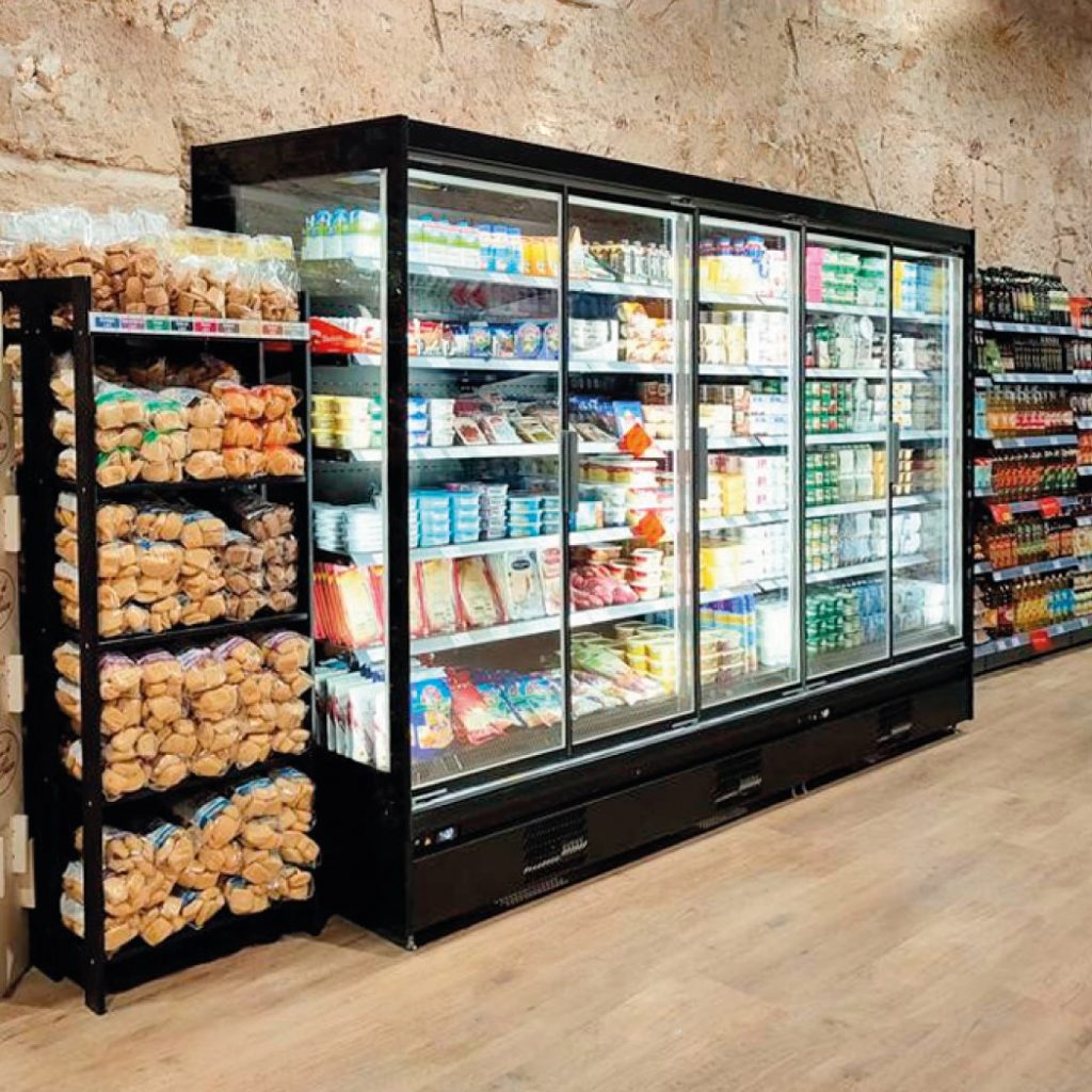 Meuble mural réfrigéré libre service à portes pour produits frais alimentaires, boucherie, charcuterie, fromage, produits frais pré-emballés